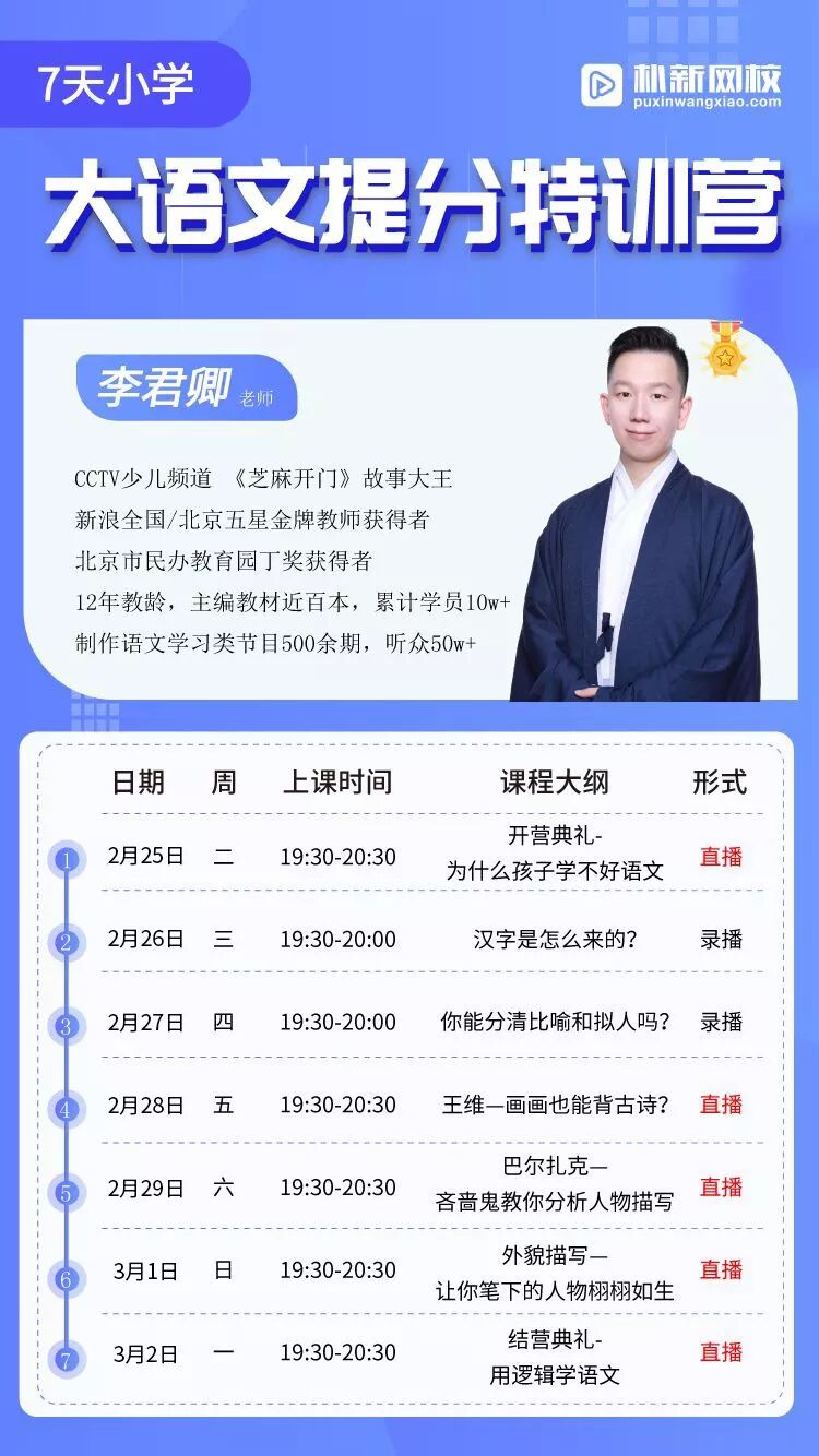7节课时是有限的,君卿老师除了在课上把最重要的知识点讲给大家外,还会告诉大家在课下应该怎么学语文。很多家长会担心错过直播,没关系,课程可以回放,反复听重点。