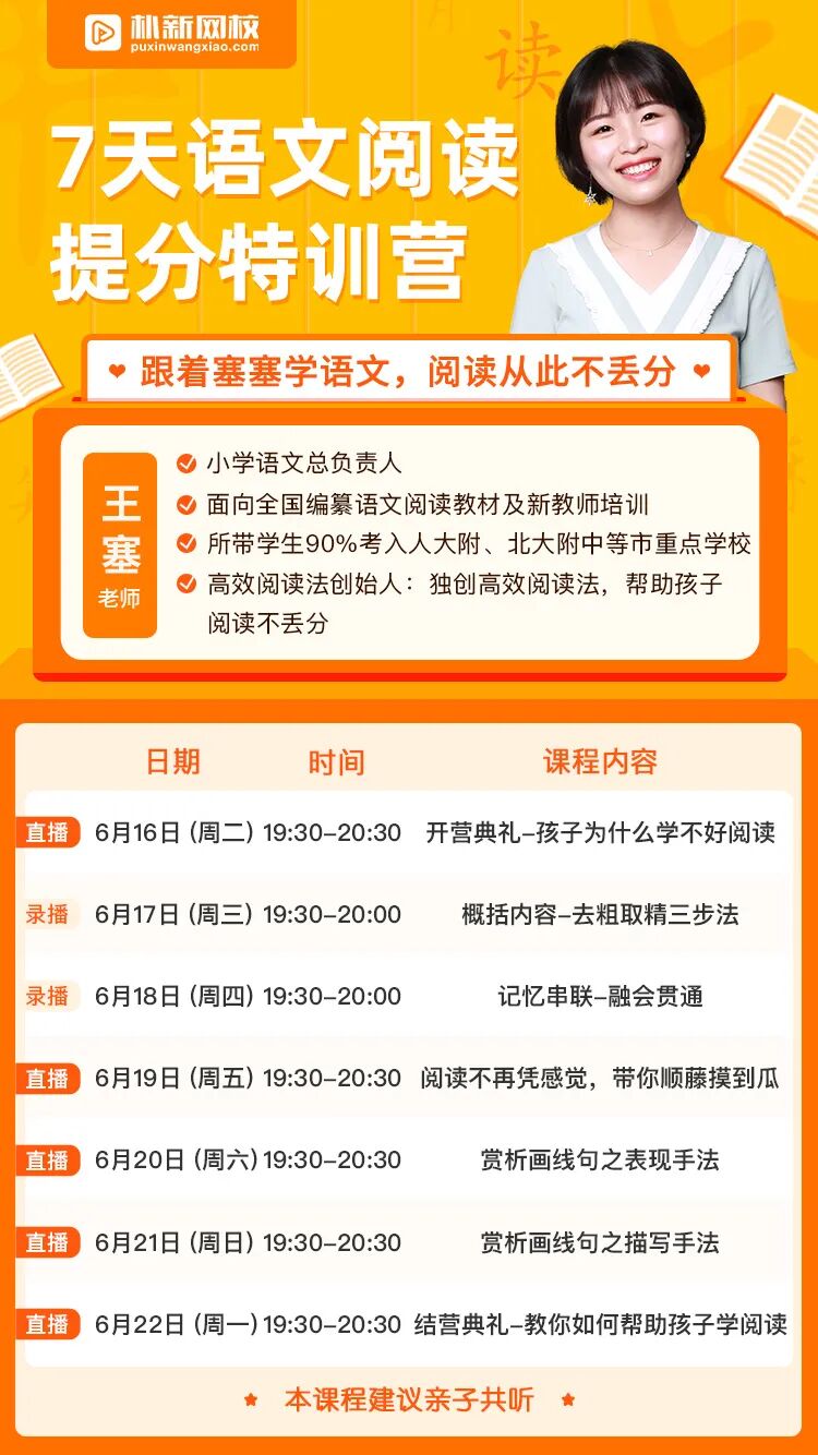 训练营主讲老师王塞出生于教师世家,高考阅读满分,语文总分148,是当地高考的语文单科状元。在王塞老师毕业后,她从普通的小学语文老师开始做起,凭借着强大的教课能力和学生们实实在在的成绩,成为了上市公司旗下朴新网校金牌讲师——不仅面向全国编纂语文阅读教材,培训语文教师,而且所带的学生90%都考入了像北大附中这样的一流重点中学。