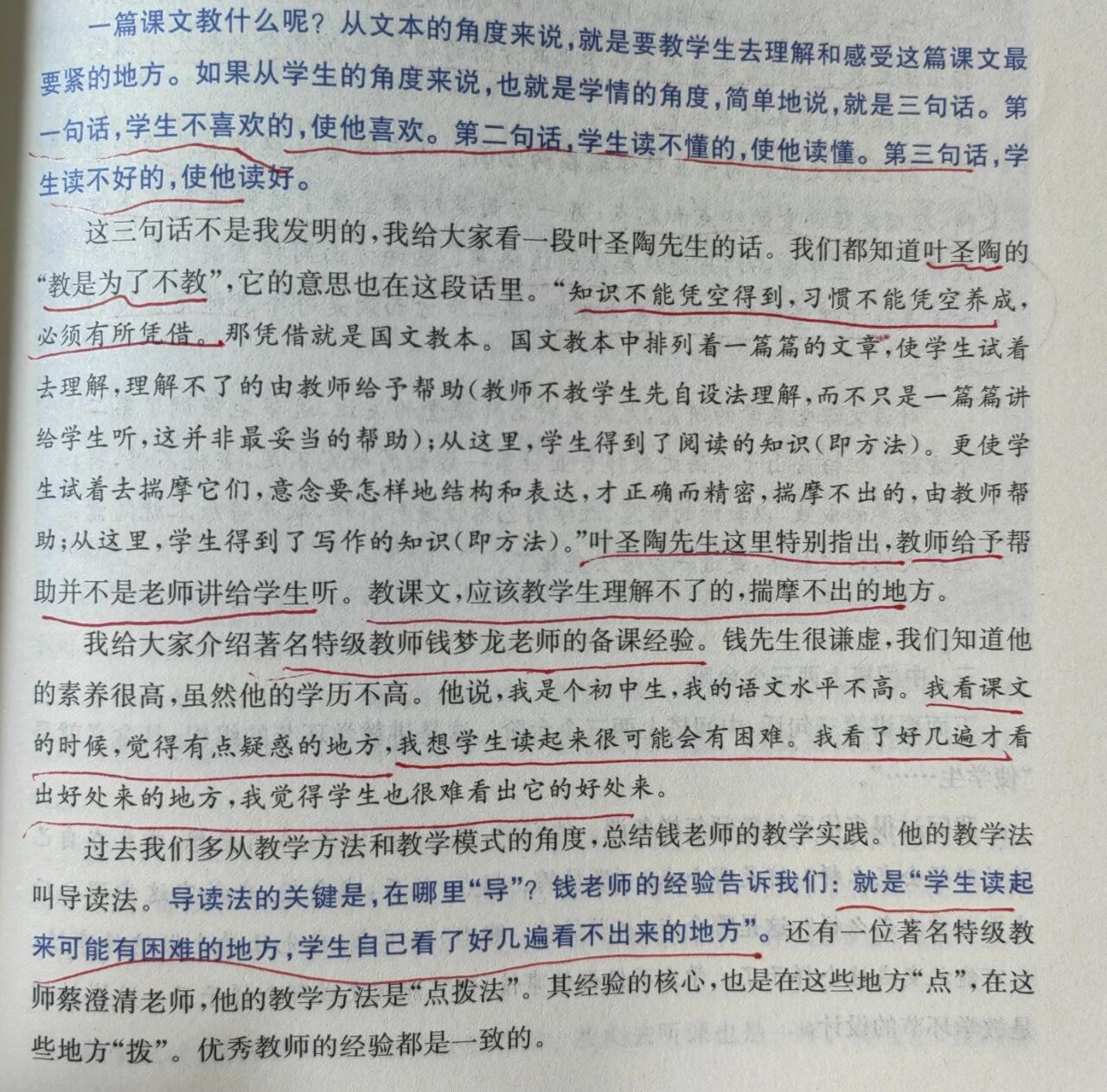 过去我们多从教学方法和教学模式的角度,总结钱老师的教学实践。他的教学法叫导读法。导读法的关键是,在哪里“导”?钱老师的经验告诉我们:就是“学生读起来可能有困难的地方,学生自己看了好几遍看不出来的地方"。还有一位著名特级教师蔡澄清老师,他的教学方法是“点拨法”。其经验的核心,也是在这些地方“点”,在这些地方“拨”。 优秀教师的经验都是一致的。