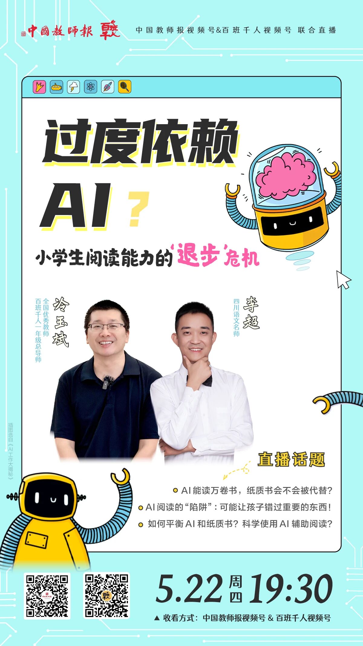 今天,百班千人邀请了一年级总导师冷玉斌和四川语文名师李超来谈一谈过度依赖AI,小学生阅读能力的退化危机。诚邀老师、学生和家长一起来探讨在孩子的学习中,AI的参与方式以及参与程度等问题......今晚19:30,中国教师报和百班千人视频号同步在线直播!