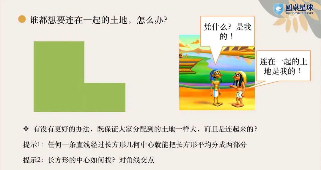比如,四年级孩子上的这堂《尼罗河岸的土地划分》,通过探究几何割补法,帮助孩子彻底理解复杂图形求阴影面积问题: