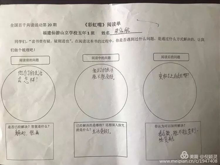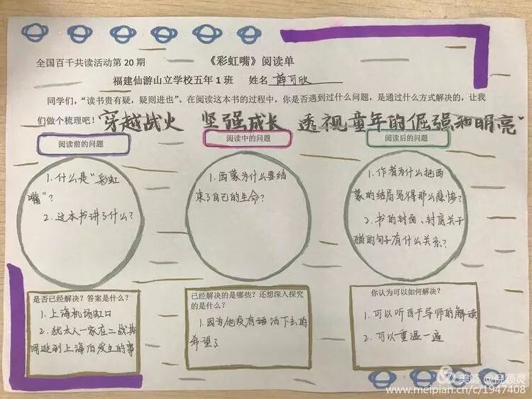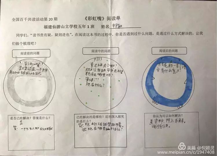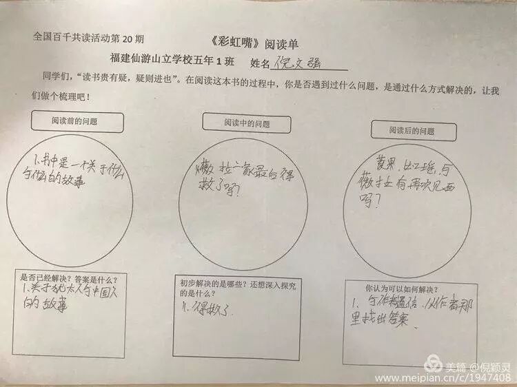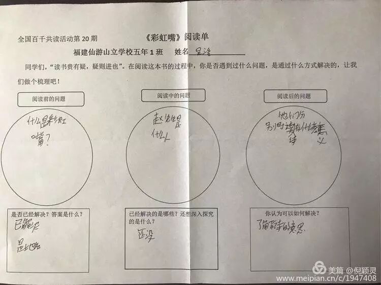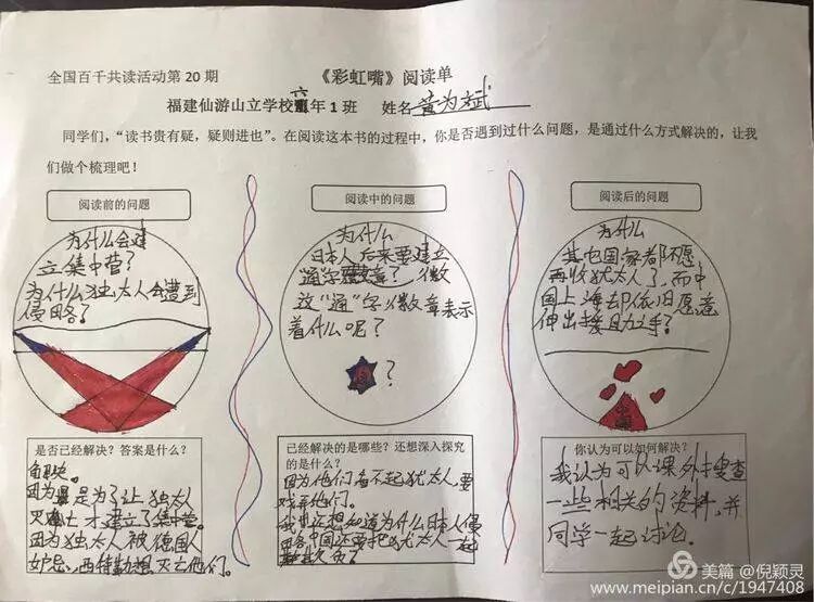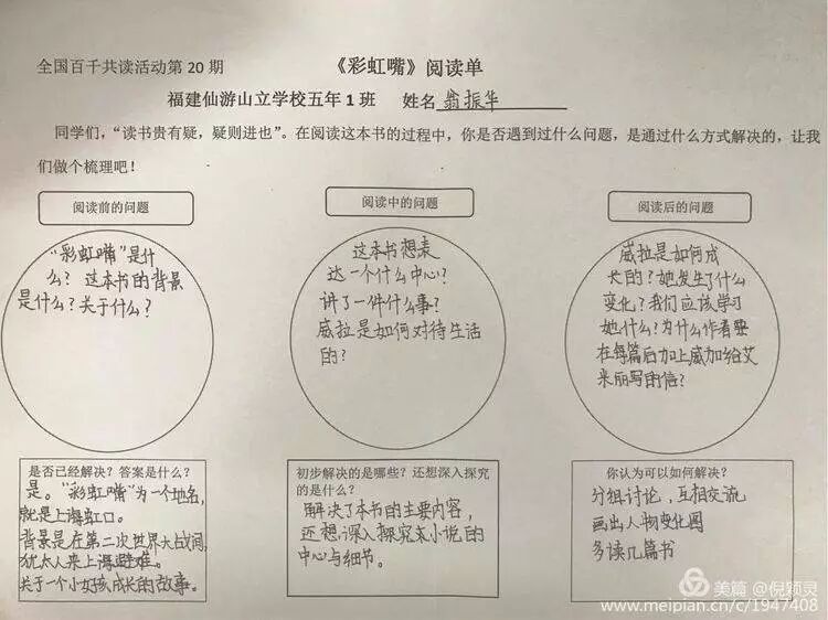 新书发布会后,孩子们开始了自主读书。"授之以鱼不如授之以渔",作为六年级最后一次的读书活动,我希望孩子们能结合过去的阅读经验,自主解决阅读中的一些问题。于是,设计了一份简单的阅读单,指向阅读前后的质疑解疑,交由孩子周末完成。