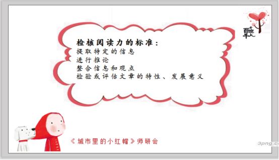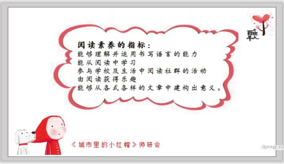 最后凤娟老师还给我们分享了阅读素养的指标,检核阅读力的标准,并为我们上好《城市里的小红帽》导读课指名了方向。