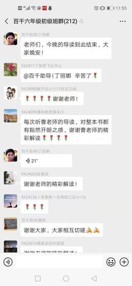 导读结束,老师们纷纷点赞,这样的导读无疑给新加入的老师打开一扇门,也激发了那些初读不明白的老师们再读的欲望。最后祖文老师的总结更是给我们指名方向,我们读的是故事,不是下围棋。相信通过今晚的导读,接下来在百千的班级里,一定会有更多精彩呈现。