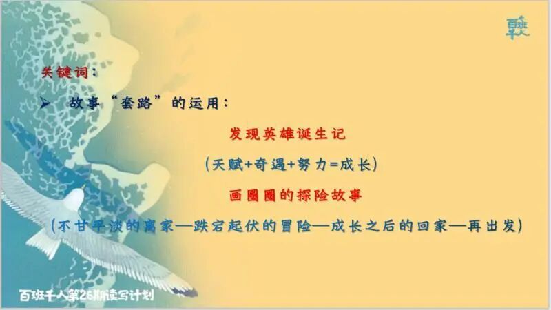 祝蕾老师强调:在《飞越风暴》这本书当中,我们既可以拓展主旨内涵,让这本书对孩子们追求真善美有所启迪,也可以去点拨这类小说情节模式的一个秘密。