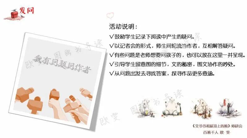 探寻图画书的过程中发问也是必不可少的。发问意味着思考,而思考恰好是深度阅读的良好开端。小朋友们总是会有这样那样的问题,就像我们让他去丰满艾爷爷这个形象的时候,他们会有很多很多想要问的问题,欧雯老师提醒我们不要去忽略孩子的每一个看似不着边际的问题,倘若加以鼓励引导,可能这些发问就会成为他们阅读的动力,也会成就一个又一个很棒的理解,很棒的创意。欧雯老师还跟我们分享了她收集到的一些孩子的问题,这些有趣的问题,可以把我们的解读引向何方呢?需要我们老师去深度阅读,带着孩子们一起驶向远方。