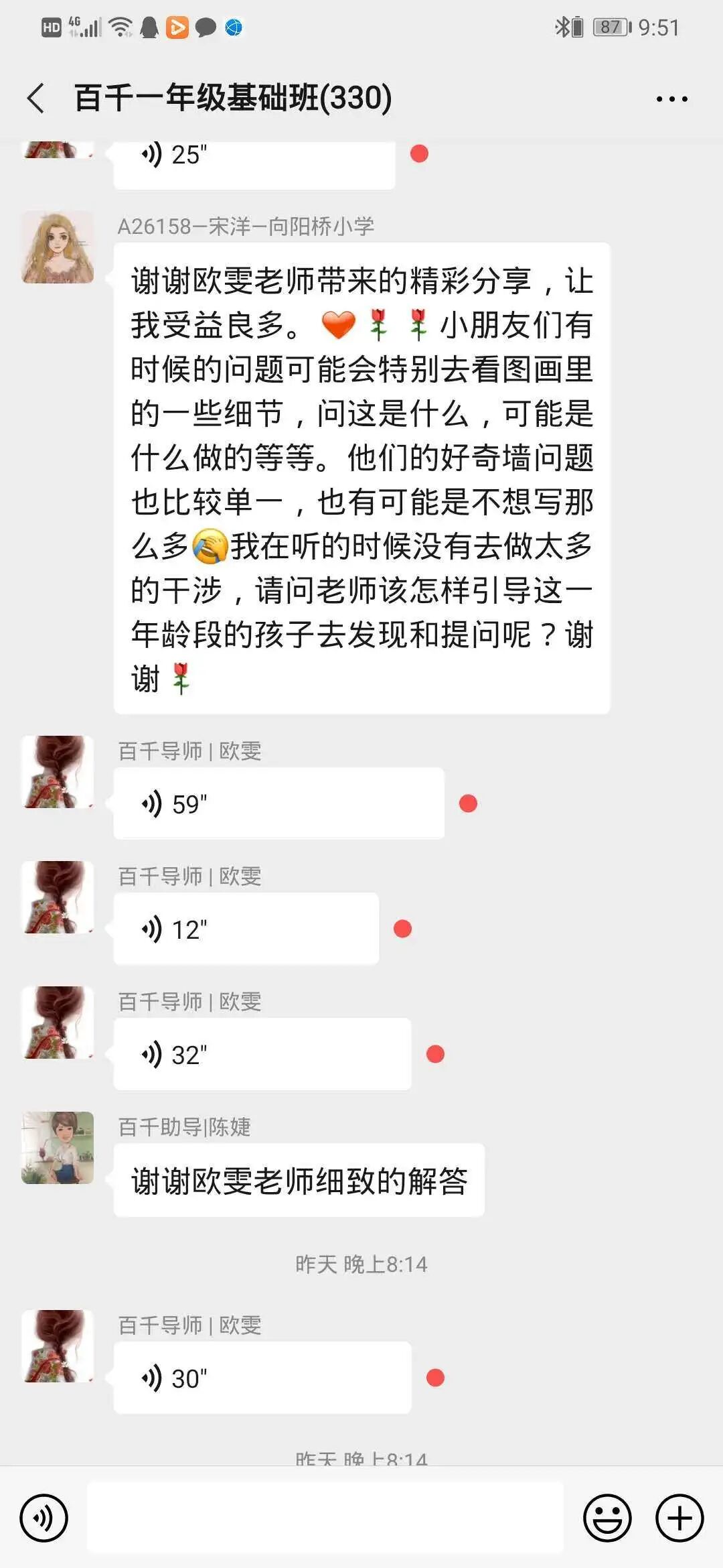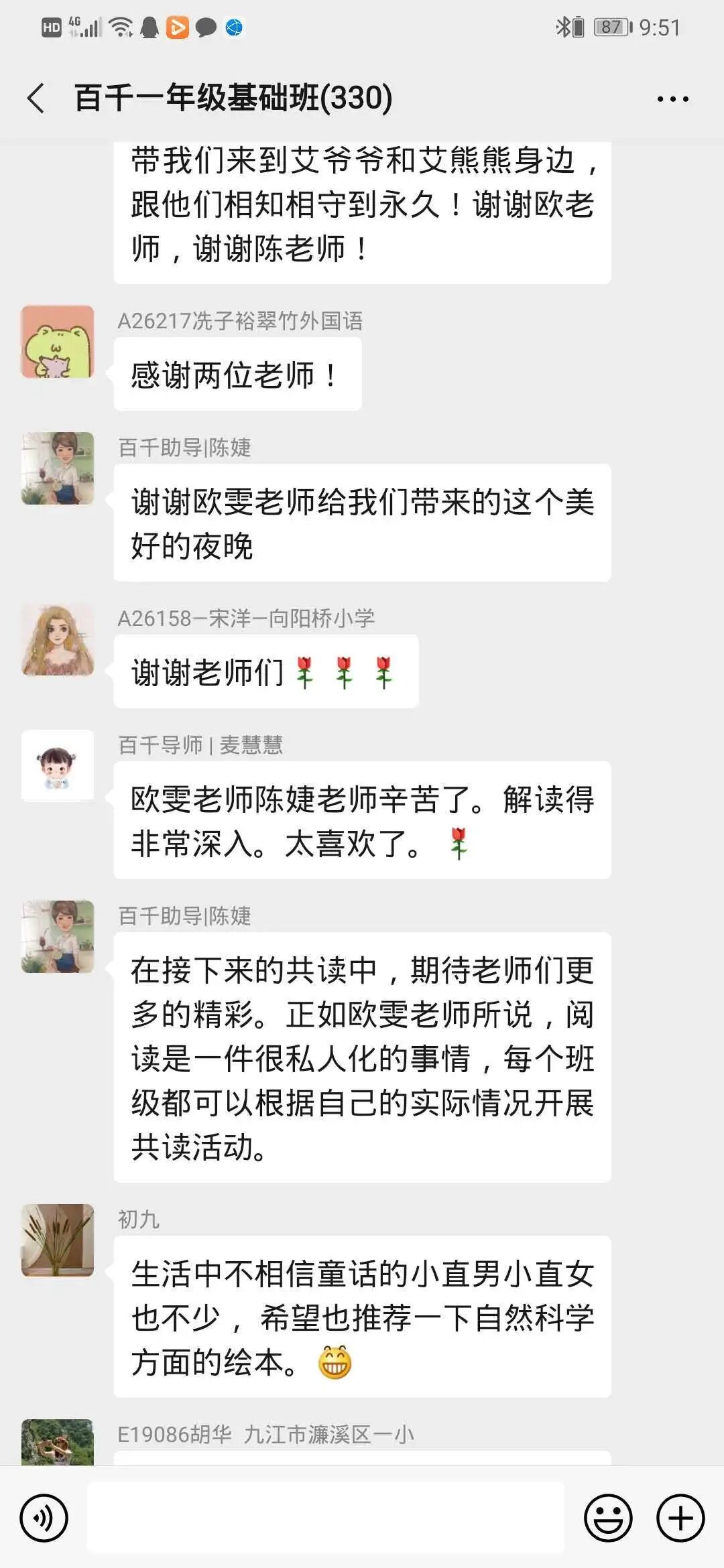 最后一年级老师们在群里互动,意犹未尽,虽然欧雯老师的分享结束了,但老师依然热情讨论,分享听后感受,学有所思,相信接下来的班级导读一定会更加精彩!