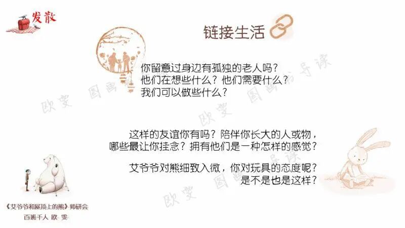 此外欧雯老师还从发表和发散两个方面给我们启发,作者在图画中的留白,他没有讲透的甚至没有文字的图画,发生了什么事情呢?作者采用了很多方法,需要我们去思考,去补白,让孩子学会表达,分享自己的想法。我们还可以通过链接生活发散思维去展开。