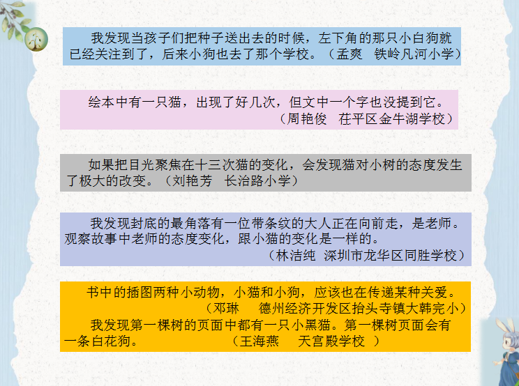 双双老师还根据上周在教师群里的问卷调查跟老师们交流发现角度。老师们有的发现是关于故事的情节的变化,有发现的是关于故事图画的细节,故事的线索,前后的比较,还有主题的表达等方面。