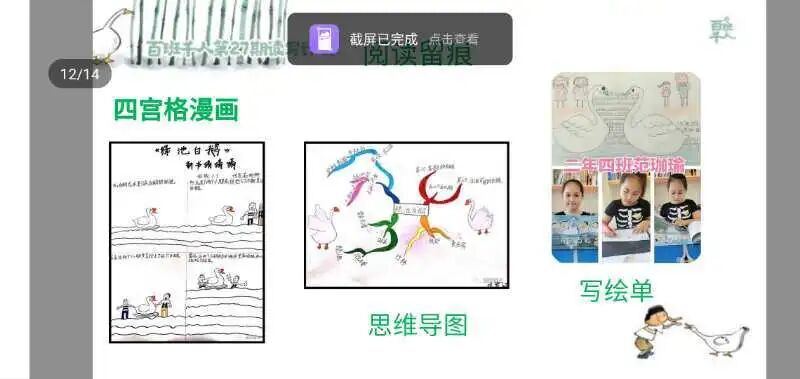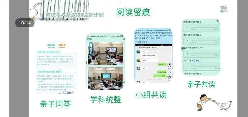 首先,张教华老师对于我们近段时间的阅读活动进行回顾与盘点。在总导师李祖文老师引领下,其他二年级百千导师多次集体备课,完成了《绿池白鹅》的初读策略和阅读发现报告单,陈秀娟老师也在群中分享了文本解读的微课,这些资料对参与共读的老师来说,是指导学生共读的风向标。在认真研读后,来自全国各地的教师在共读群中积极分享自己班级的共读经验,在百千的大家庭中共同成长。