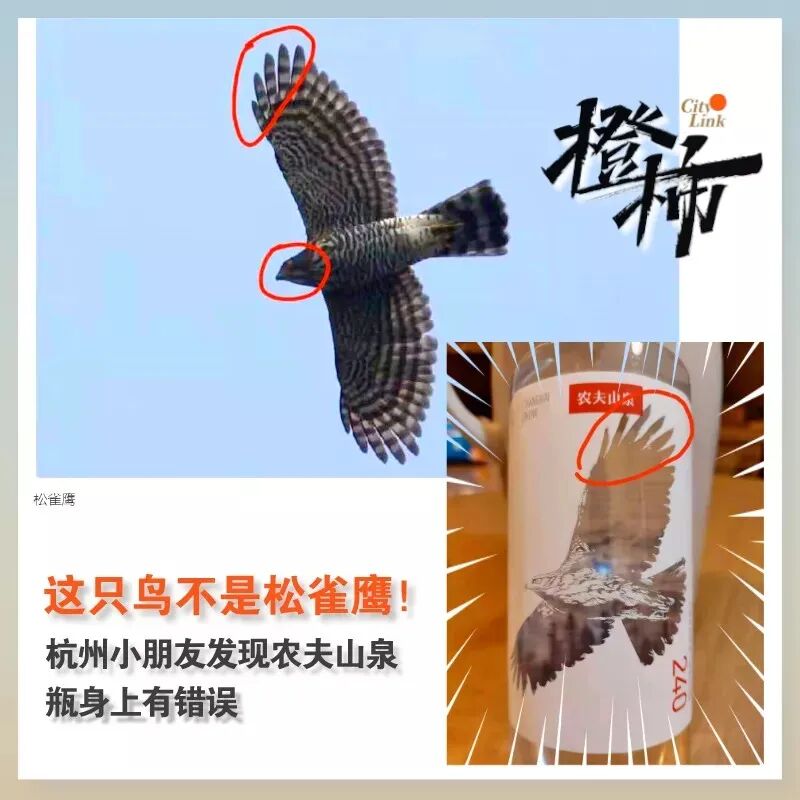 前些天,我的科学老师布置了一个作业——做一个水钟。水钟,简单说就是用一个透明容器,按照一定的滴水速度和瓶子里的水位来标示刻度,从而实现计时功能。因为家里没有合适的容器,所以妈妈替我买了一瓶矿泉水,瓶身光滑没有纹路。一看到这瓶水,我就立刻被瓶身上的猛禽图案吸引了。“这是哪种猛禽,是雕吗?”我心里琢磨着。转动瓶身,发现这只“猛禽”旁边印着两列小字,“长白山已知野生鸟类240种,松雀鹰是国家二级保护动物”。“哦,原来这画的是松雀鹰啊……诶,不对呀,这长相这气质怎么可能是松雀鹰?我是不是眼花了?”作为一只一年鸟龄的“小菜鸟”,我的第六感告诉我这肯定不是松雀鹰。翻查我的宝书《中国鸟类观察手册》,直觉得到了印证,松雀鹰在中国最北的记录是辽宁旅顺,但离长白山还差八九百公里路,开车需要一天才能到呢。和图鉴上的松雀鹰照片对比,我又发现了更确凿的铁证:松雀鹰只有五根翼指,而矿泉水瓶上的猛禽却有六根翼指,并且比松雀鹰更加明显!再仔细对比,头部的形态特征也不一样。带着疑惑和发现秘密的兴奋之情,我立刻把这个发现告诉了爸爸妈妈。他们听说有这么明显的错误,鼓励我要把它搞明白,还建议我去“浙江野鸟会”的微信群里向观鸟前辈们请教。很快,有四五位观鸟经验丰富的老师回复了,其中还包括“七”和“紫啸东”两位大神,有的说它像苍鹰,有的说它像某种鵟,也有认为它“四不像”,总之肯定不是松雀鹰。读三年级的妹妹也在一旁说,做科普也不能这么马虎呀,就算是给产品打广告的也要认真啊,要不然小朋友们认错了可就糟糕了。想起以前遇到的其它科普材料里的错误,我想我以后也不能完全相信广告和手册上的小科普了,发现疑问一定不要放过,改正错误也是学习知识的好办法呢!记者联系了浙江自然博物馆的鸟类专家。专家回复说:“孩子是对的。从分布区还有翅膀特征这两方面可以基本判断不是松雀鹰。”专家说,翅膀尖上那几根特别长的羽毛是猛禽的重要识别特征,小朋友的观察很仔细。