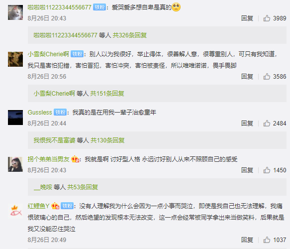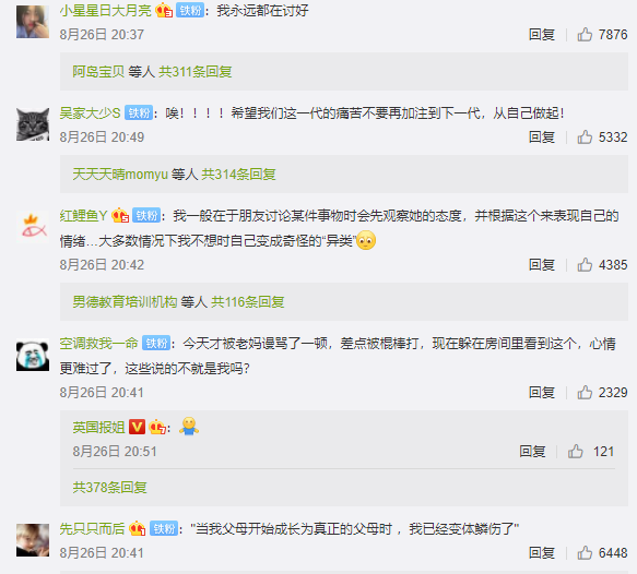 因为父母易怒,所以孩子尽量把自己隐藏起来,避免与父母发生正面冲突。他们忽视自己的感受,因为生活中的痛苦太多,孩子必须如此,才能不那么痛苦。Jodi A.就说:“我会把所有的情绪都藏起来,而不是释放出来。”另一位孩子也说:“我必须忽视自己的感受,和别人接触对我来说很困难。”一位孩子说:“我父亲在身体和情感上都会虐待我,而现在,我不会谈论自己的感受,而是永远在尝试取悦别人,即使这意味着伤害自己。”“我永远奉承别人,我永远小心翼翼地想好每一句说出口的话,我永远在取悦别人。因为如果不这么做,我也许就会面对严重的抑郁情绪,或是突然的暴怒。”有网友说:“无论我付出多少,我都是被抛弃的那一个。”但倘若父母情绪都不好,动不动就“我怎么养了你这么个东西”、“就当我没生过你”,孩子怎么可能会开心,会有安全感呢?主持人问她:你父母说过什么话,让你觉得,对你伤害最大?我妈气急之下对我说,我就当没养你这个女儿,以后老了我也不指望你养,我自己过。