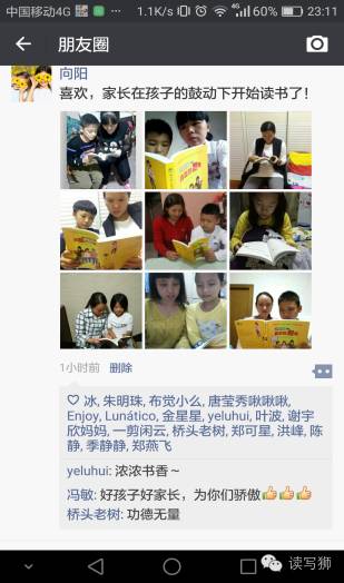 三、启动亲子共读 亲子阅读在农村实施起来的确有很大的困难。打工的家长一天到晚上班,离婚的家长把孩子抛给爷爷奶奶,剩下的家长在家了,又把孩子送进了家教辅导班。唉,没有时间,没有精力,水平不高,亲子阅读想说爱你都不容易。因此,亲子阅读只有慢慢来。我针对现状,规划了一下,四步走:第一步,统一思想。第二步,把书翻起来。第三步,只言片语的感受。第四步,树立典型,以点染面。只有在班级阅读慢慢扩大、加深的过程中,才能促成家长自觉意识的发生。正如班级读书会群所坚信的:星星之火,终可燎原。按照这样的部署,在第三期“百班千人”活动申报前,我们开了一次家长会。我们向家长强调孩子的差距就是家长的差距,孩子的差距就是阅读的差距。然后,借用《苗苗老师的阅读建议和阅读愿景》,我来给家长做了初步的亲子阅读培训。等家长有了心理准备后,当我们班入选全国第三期“百班千人”共读活动的第一时间里,我向家长和孩子公布了这个好消息。接下来就是行动了。选书,购书,家委会很积极。书到了,我号召大家动起来。“挤挤挤,共读的法宝。”于是,挤时间,亲子读,晒照片,享温馨。由于我当初没有提出让家长写感受,因此我关注的是家长有无挤时间读的态度。如王壮壮妈妈被儿子催着阅读,徐锦浩妈妈说书很好看,下班继续看,以及我转发自己朋友圈的点赞来激励家长,营造浓浓的读书氛围。