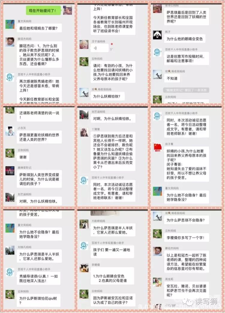 10月15日,周六的傍晚,我和小果子们一起期待着“学生网络共读”。陈秀娟老师带着她的学生,一边聊一边交给孩子们各种读书方法——检视性阅读、孟子读书法、司马光“诵读法”、结网式阅读、主题讨论、创意写作。一听到“萨斯琪应该回到妖精的世界,还是留在人类世界?”孩子们就炸开了锅 ,表达看法,说明理由,稚嫩的语言里流露出他们对萨斯琪的关心和喜爱。我也在一旁偷着乐,这些小鬼还真是读懂了一些!很期待和他们聊聊书。