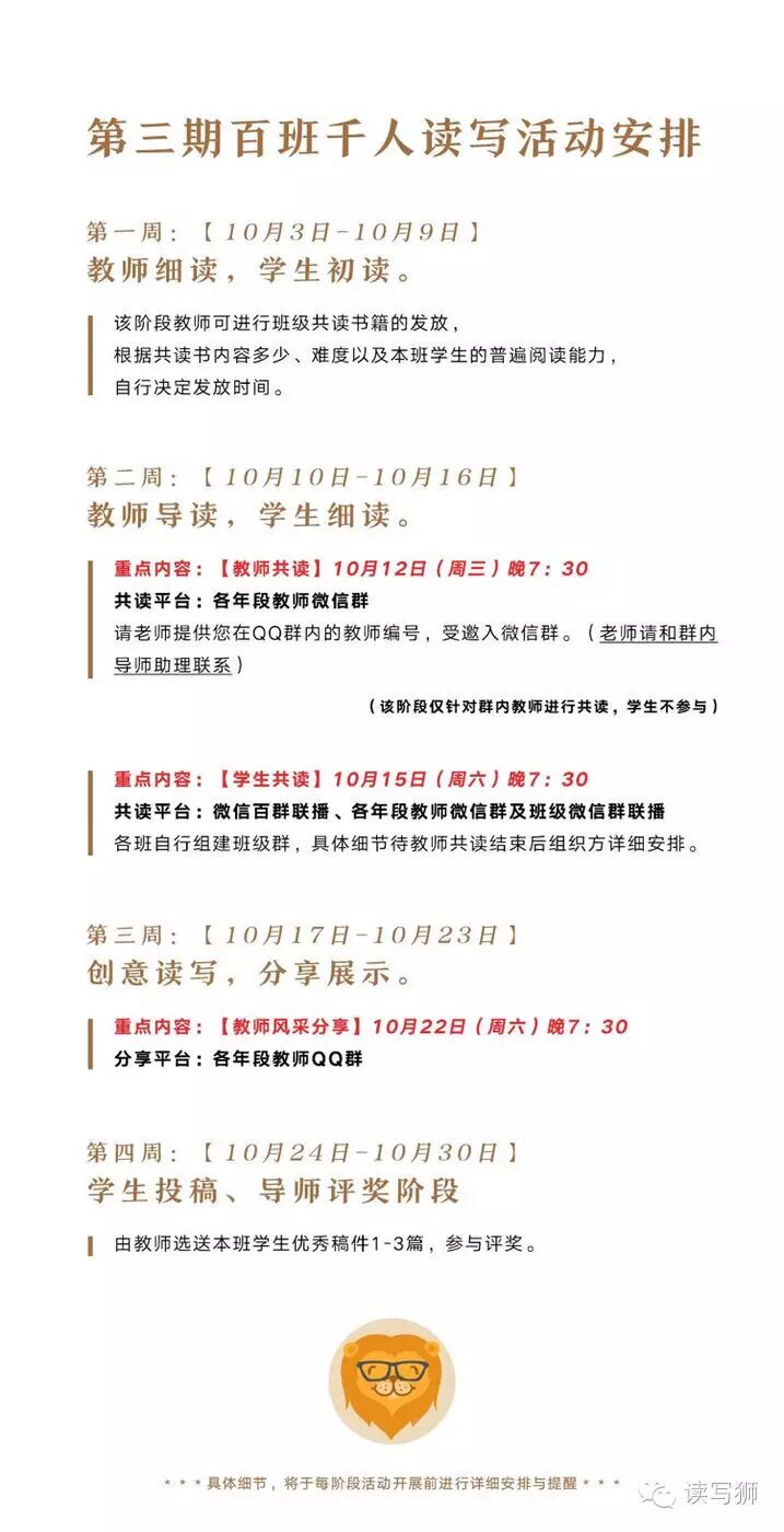 这是我和孩子们第一次参加“百班千人”的活动,从倡议家长们买书→学生初读→教师共读→教师导读→学生细读→亲子阅读→生生共读→创意读写→读书交流会。国庆放假后到今天已有21天,整个过程还算顺利,大部分都是“拿来主义”,在导师们的引领下,带着孩子们看书,更具体,更系统了,不像以前仅凭自己非常狭隘的想法去带领孩子阅读!