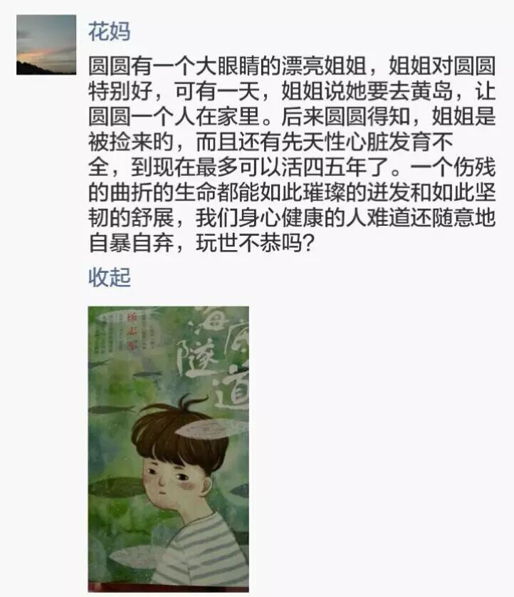 6、圆圆有个捡来的大眼睛漂亮姐姐,而且有先天性心脏病,但她的生命之花依然开的璀璨,我们这些身心健康的人难道不应该珍惜现在的每一天吗?