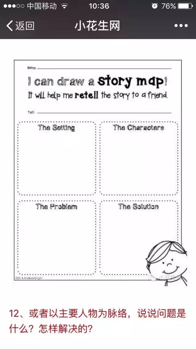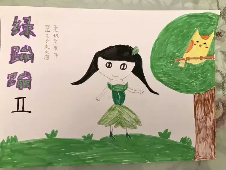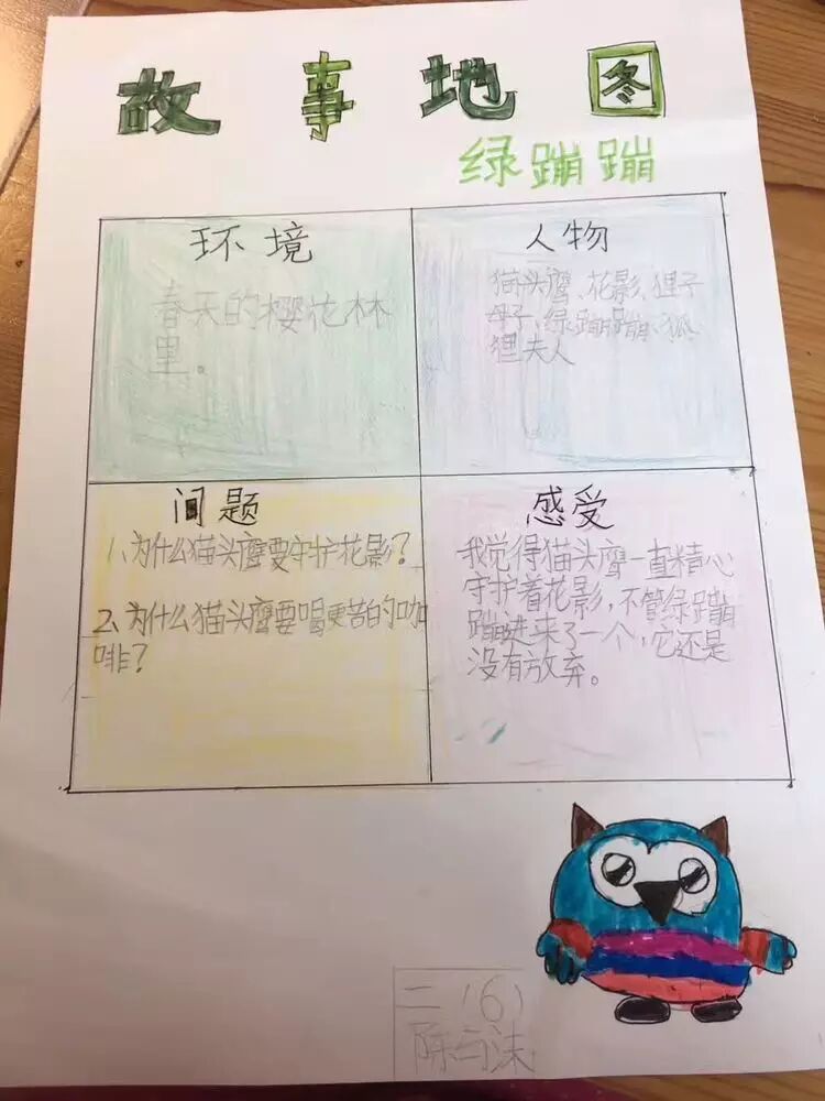 陈与沫同学在课外英语辅导班学会了用"故事地图",这一次用来做《绿蹦蹦》的故事地图。各种知识的灵活运用到了阅读活动中来了!