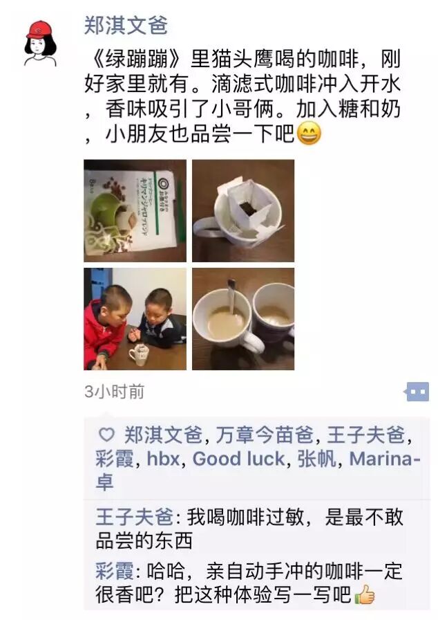 细致入微地阅读《绿蹦蹦》之后, 封三封底关于咖啡的描述引起了郑淇文郑淦文兄弟的强烈关注。一起动手冲起了咖啡,好香呀!