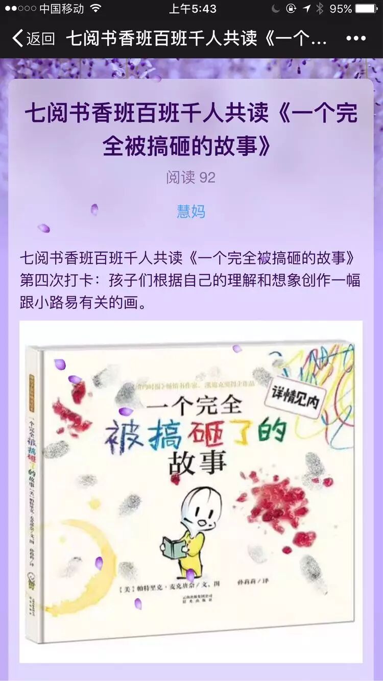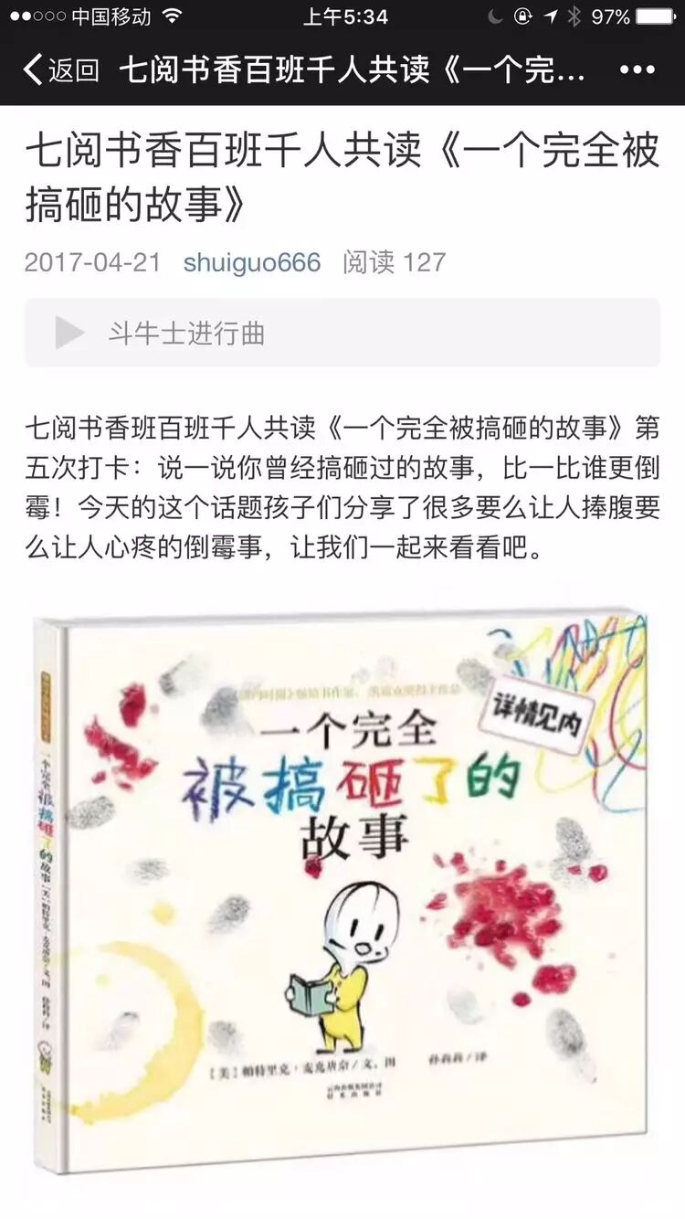 2017年4月12日拿到新书《一个完全被打砸的故事》,南外科苑小学一七班的宝贝们兴致勃勃的开始了百班千人共读一本书活动!