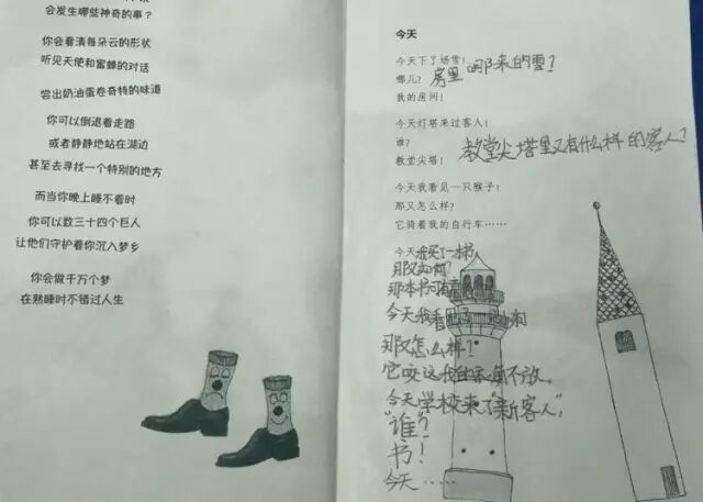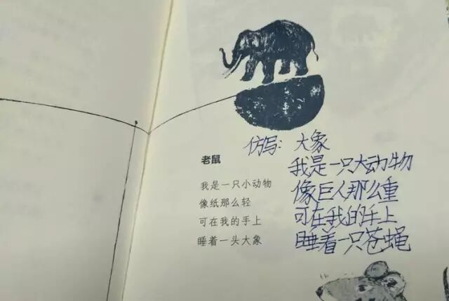 读着,读着,声音不见了。娃们拿出笔,开始窸窸窣窣写起来。哇,果真是有感而发!小胖最积极,只听得他一会儿喊一句——“仿写成功!”