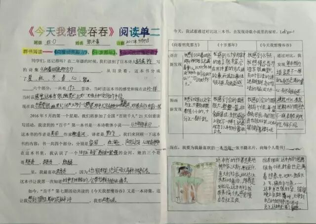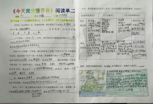 今天,孩子们带来他们二年级时读过的书——金子美玲的【向着明亮那方】,和“百千”第一期共读的书——【十岁那年】,与现在正在读的【今天我想慢吞吞】进行群书阅读。