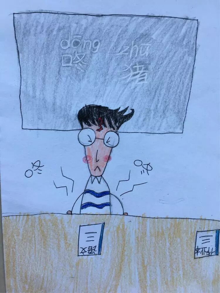 今天第一堂课是雷老师的语文课。他笑眯眯地走进教室,高兴地站在讲台上,看来他今天心情不错。