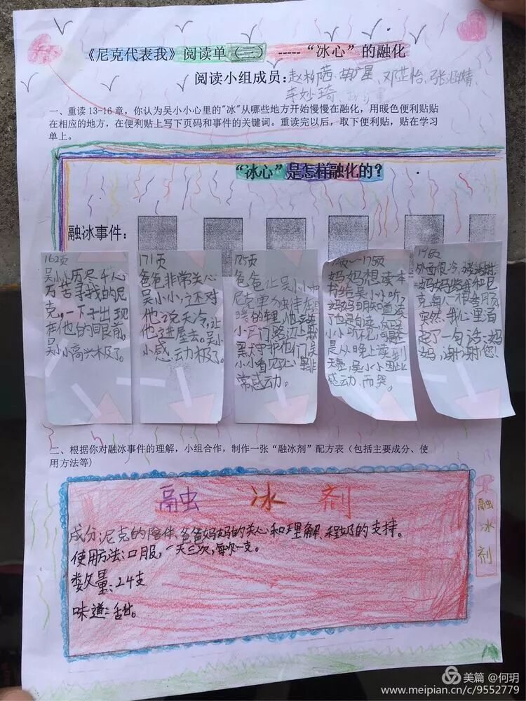我组织学生以小组合作的方式,每个人找到两到三个融冰事件,将事件的内容写在便利贴上。